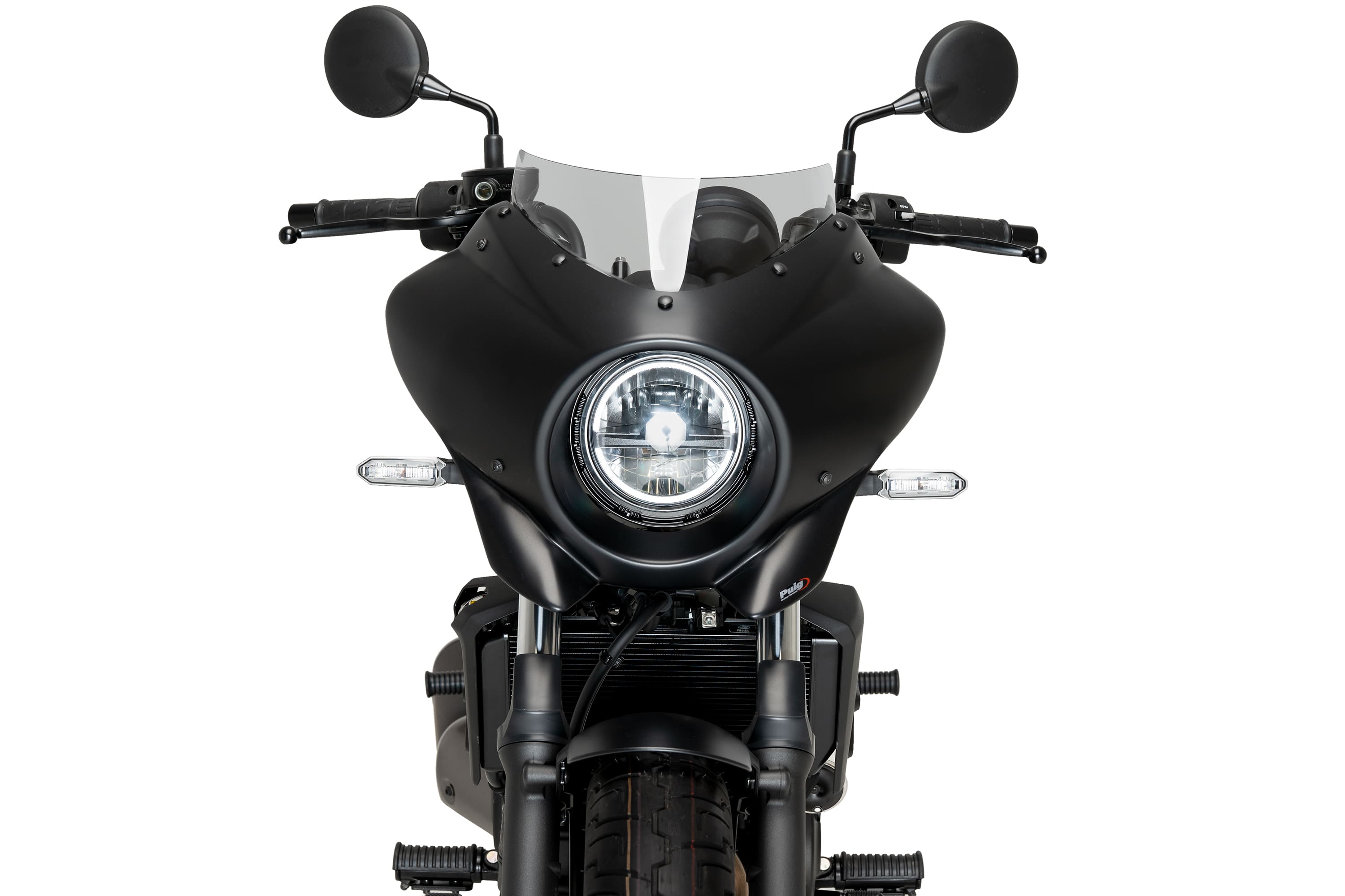Sport windscherm met glanzend zwart koplamp-kuipje voor de Kawasaki Eliminator 500 (2024-). Biedt een sportieve uitstraling en verbeterde bescherming tegen rijwind.