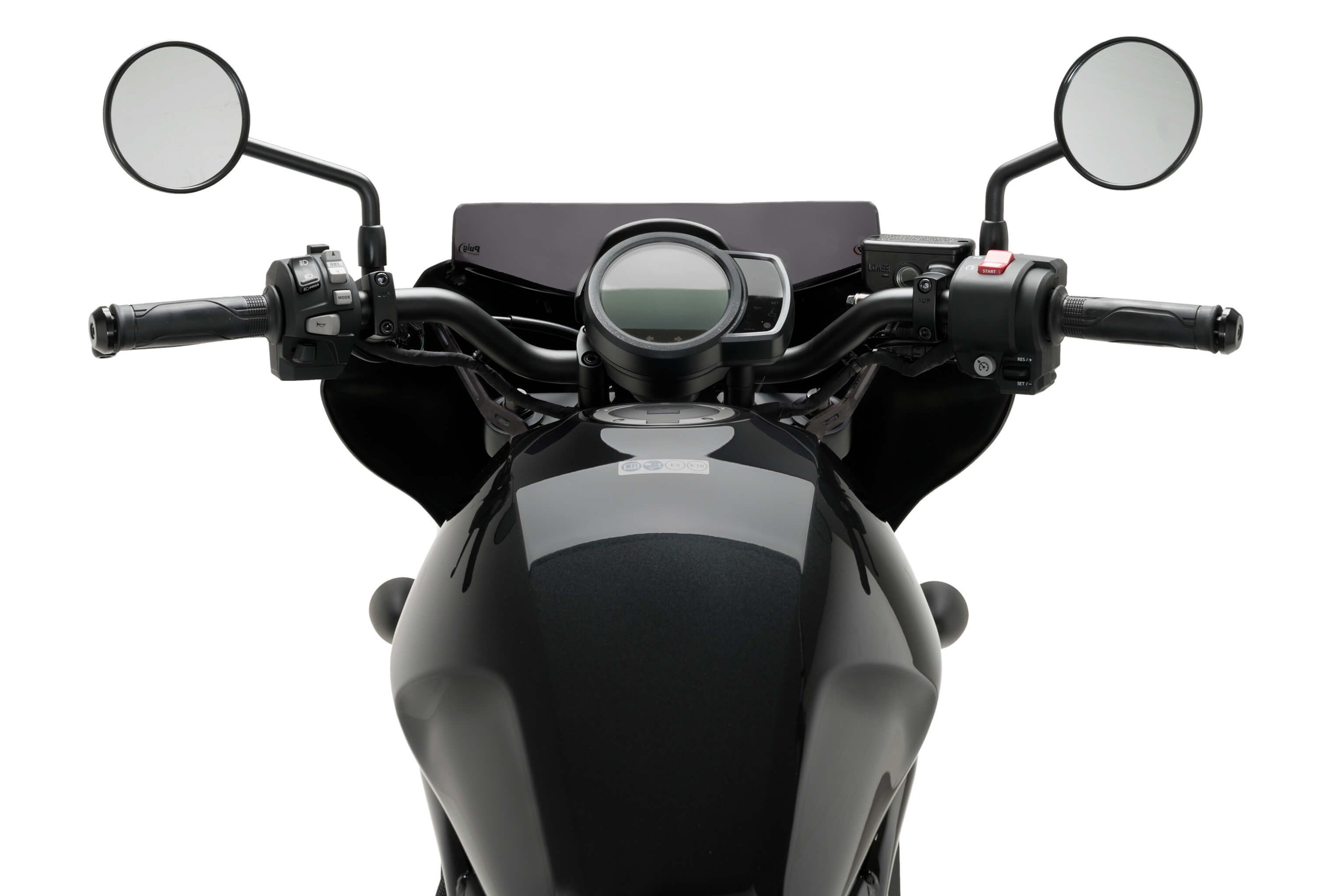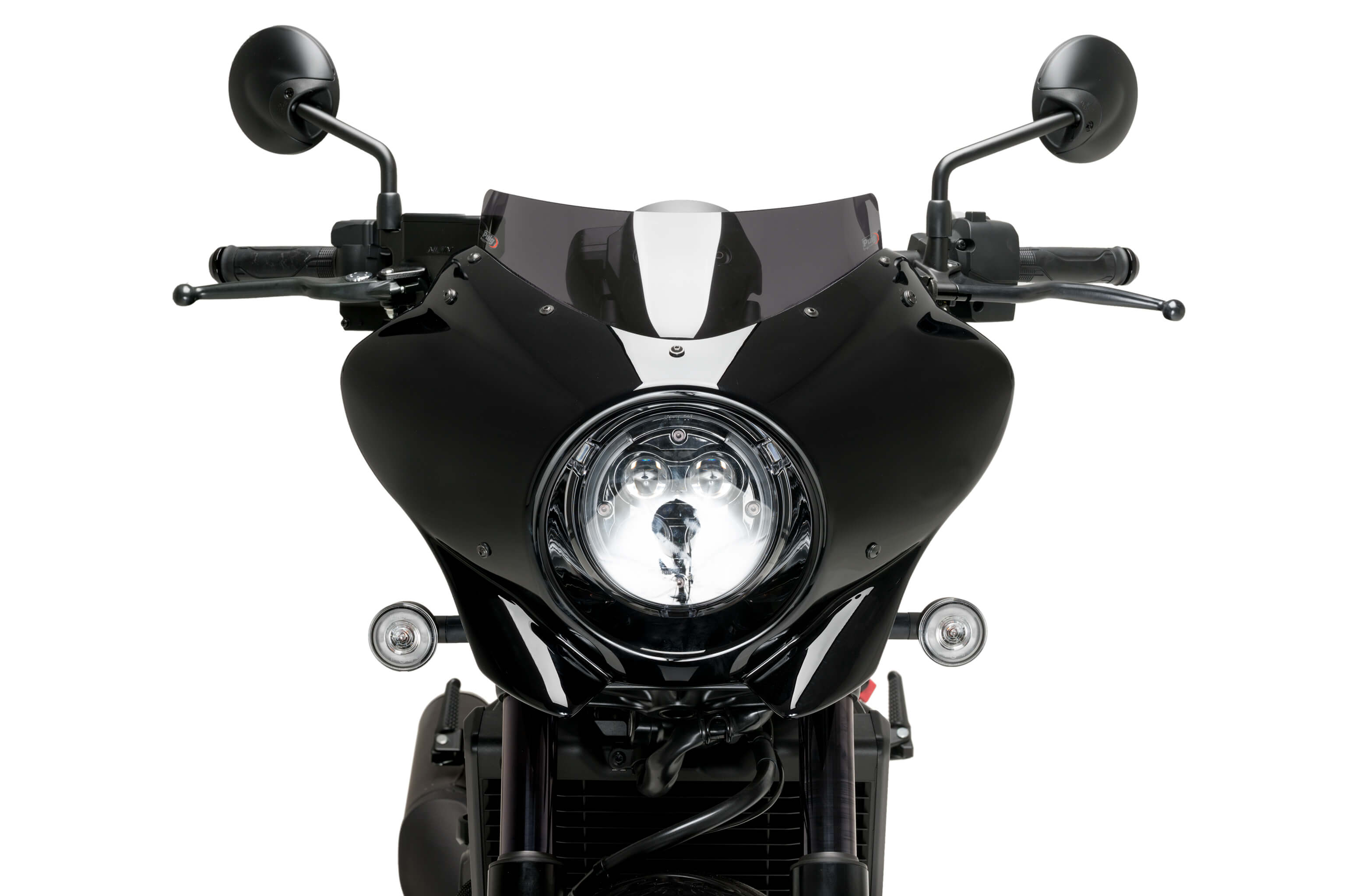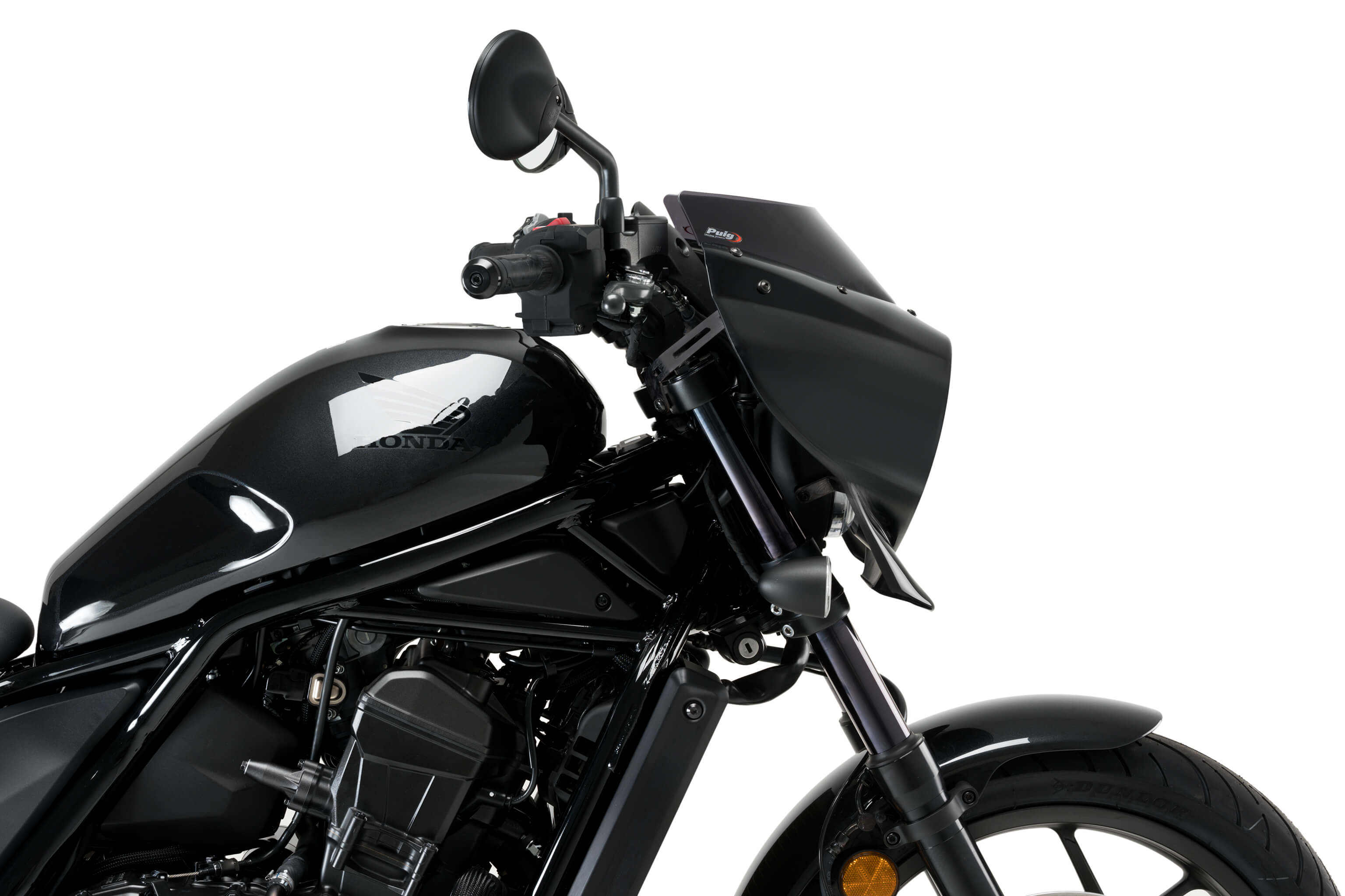 Sport windscherm met glanzend zwart koplamp-kuipje voor de Honda CMX1100 Rebel. Biedt een sportieve uitstraling en verbeterde bescherming tegen rijwind.